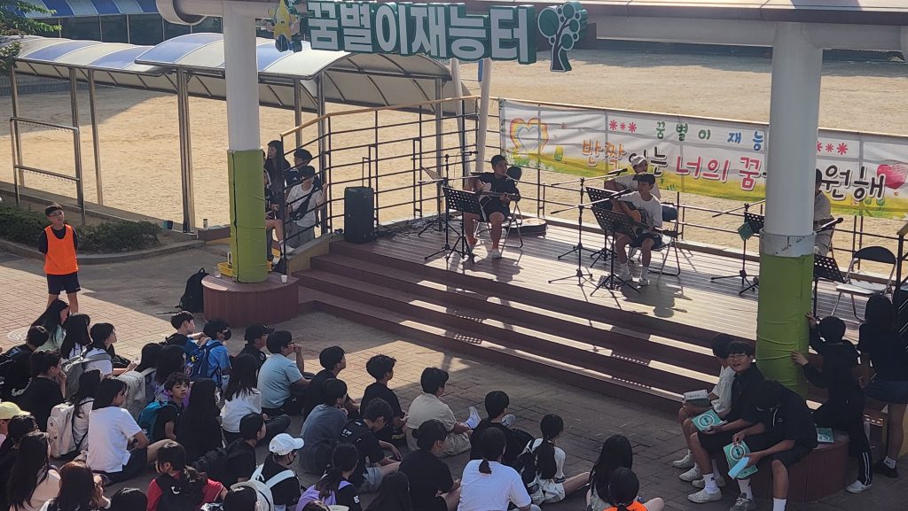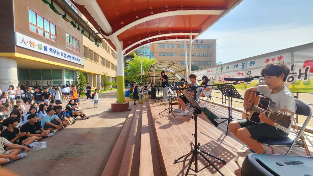 오산고현초등학교(교장 박성복)는 6월 21일 「꿈별이 재능터」에서 ‘아침을 여는 통기타 버스킹 공연’를 개최했다.