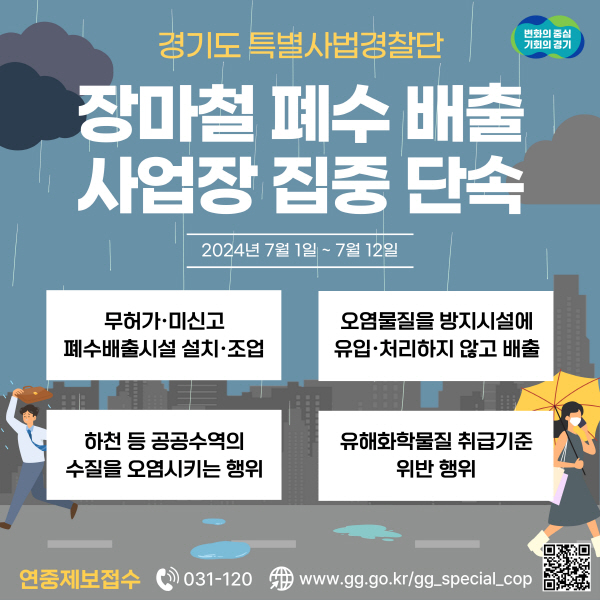 경기도 관계자는 “특히 장마철에 폐수 무단 방류 등 수질오염행위의 발생이 예상됨에 따라 폐수 배출사업장과 유해화학물질 취급업의 불법행위를 집중 단속해 안전하고 깨끗한 하천이 조성될 수 있도록 하겠다”고 말했다.