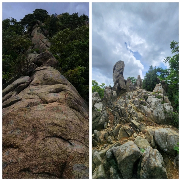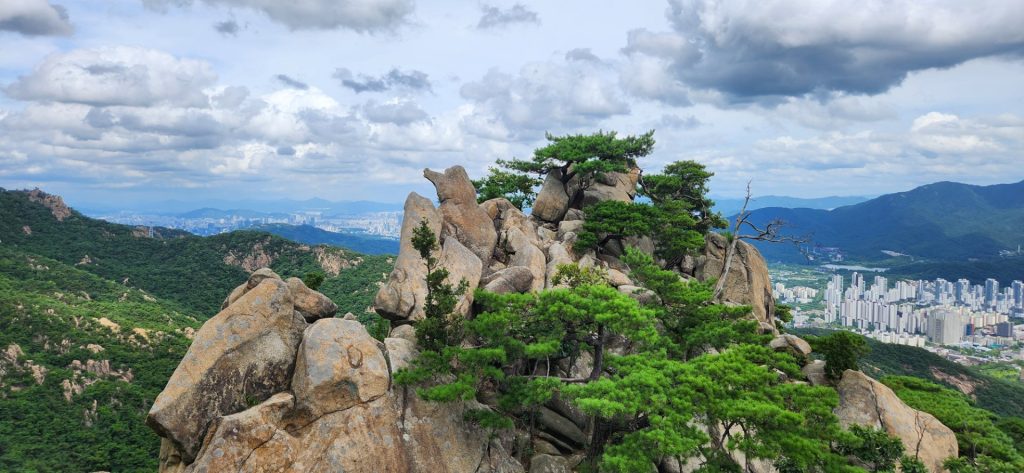 후퇴는 없다, 비가 와도 전진. 오르다 보니 1봉 아기 코끼리바위와 2봉 사이를 지나, 3봉은 패스(우회)하고, 4~5봉을 지나 6봉 국기대 도착했다. 잠시 바람에 땀을 식히며 물 한 병을 순간 다 마셨다. 어제 걸어 보았던 광명5산을 보며 관양능선으로 하산을 해 인덕원 8번 입구에서 등산을 종료했다.