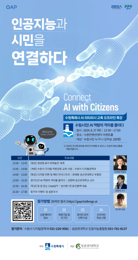 대면 교육은 8월 27일 오후 1시 30분부터 5시까지 수원컨벤션센터 이벤트홀에서 열린다. ‘디지털 대전환 및 메타 인더스트리’(최재붕 성균관대학교 부총장), ‘말 잘 듣는 CHAT GPT 만들기’(임지환㈜포인블랙 대표) 등을 주제로 한 강의가 진행된다. 시민 200명을 선착순으로 모집한다. 8월 26일까지 GAP 홈페이지에서 신청할 수 있다.