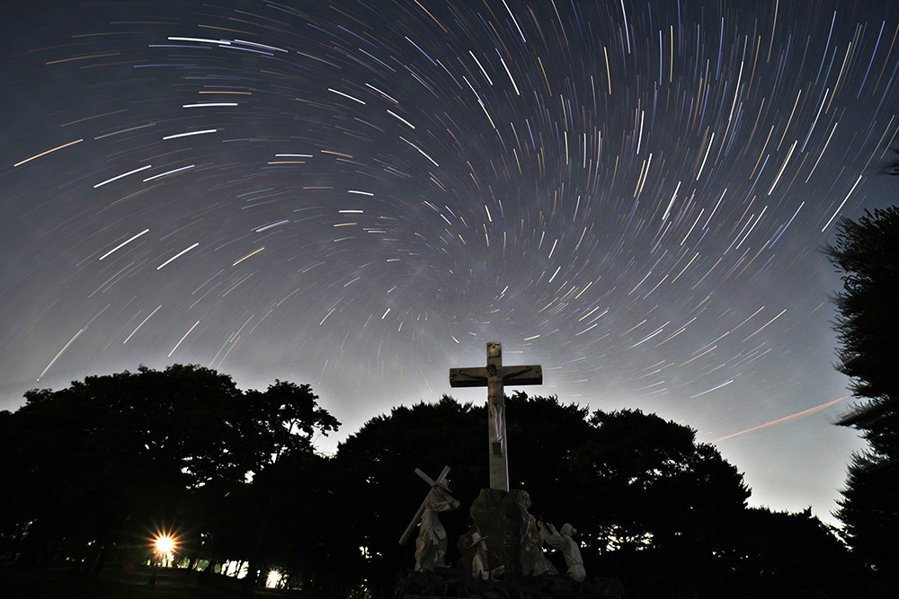 이 날 찾은 솔뫼성지는 구름 한점 없이 맑은 날씨임에도 불구하고, 저녁 9시부터 삼각대 설치하면서 촬영을 시작하니, 비행하는 물체로 인해 별 궤적의 흐름이 깨지고 있었다. 솔뫼성지의 별 일주는 늦은 밤 11시를 지나 촬영해야만 원하는 샷을 얻을 수 있다. 수시로 날아드는 비행물체로 인해 초롱초롱 빛나는 별도 북천일주를 완성하는데 어려움이 있다. 이럴 때는 단컷으로 찍어서 일명 ‘회오리별’이라는 별돌리기를 하는 수 밖에!