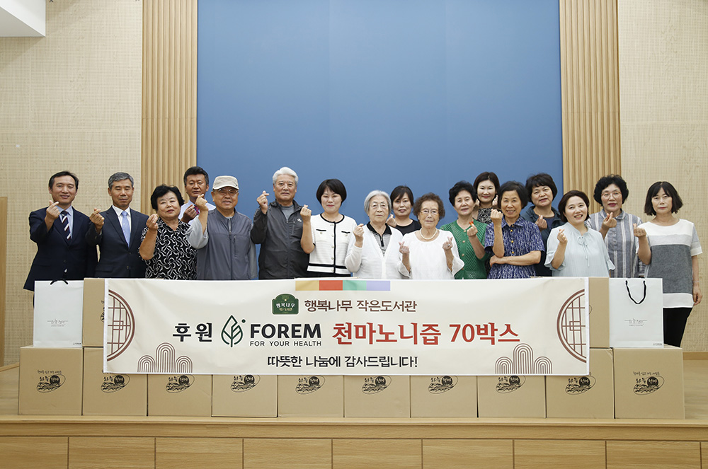 포렘이 천마노니즙 70박스를 전달한 행복나무 작은도서관은 평소 우리동네 건강교실, 킨즈키프로젝트, 독거노인 책 읽어드리기 등 프로그램을 운영하며 은둔과 고독에 노출된 이웃을 찾아내 사회교류에 힘쓰는 것으로 알려져 있다.