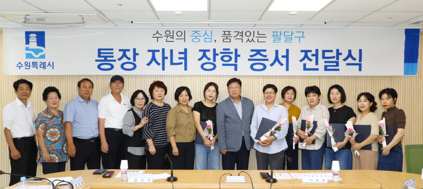 수원시 팔달구(구청장 이상균)는 지난 20일 구청 상황실에서 지역사회발전과 주민화합에 기여하고 있는 통장 7명에게 ‘통장 자녀 장학 증서’를 전달했다.