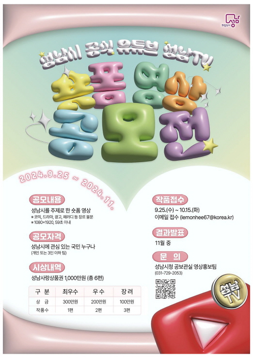 이번 공모전은 성남의 주요 정책, 문화, 명소 등을 주제로 한 참신하고 재치 있는 숏폼 영상을 발굴해 시 홍보에 활용하고자 마련됐다.