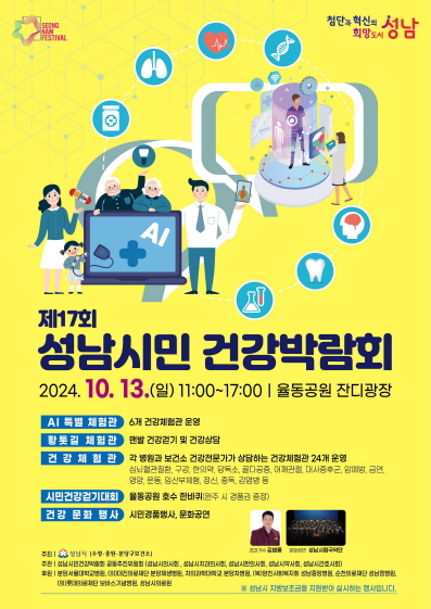 성남시민건강박람회 공동추진위원회가 주관하는 이날 행사는 시민의 건강 증진을 위해 마련돼 인공지능(AI) 특별체험관, 황톳길 체험관, 건강체험관, 걷기대회, 문화 공연 등 다양한 행사로 채워진다.