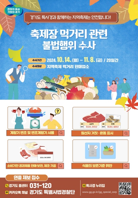 기이도 경기도 특별사법경찰단장은 “가을철 지역축제에서 인기가 많은 식품 등에 대한 점검을 실시해 방문객에게 안전한 먹거리가 공급될 수 있도록 하겠다”면서 “식품안전에 위협이 될 수 있는 불법행위에 대해서는 관련 법령에 따라 강력하게 처벌할 방침”이라고 말했다.