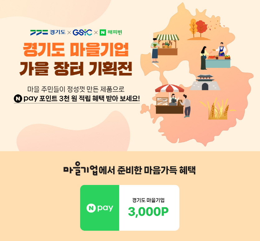 마을기업 가을장터 기획전은 네이버 해피빈 누리집에서 확인할 수 있으며, 제품 금액과 관계없이 1개 이상 구매 시 네이버포인트 3천 원이 적립된다.