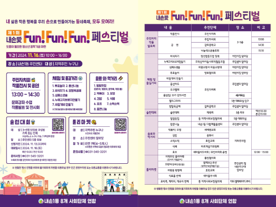 행사에서는 주민자치회 작품발표 및 공연, 지역사회보장협의체의 일일찻집, 투호, 양말 목공예 등 체험부스가 운영된다. 또한 가족이 함께 참여할 수 있는 슐런대회와 주민센터 앞마당에서 열리는 플리마켓도 예정되어 있다.