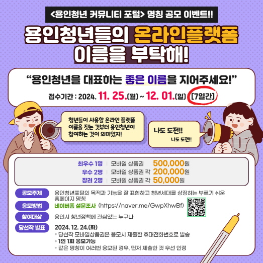 시 관계자는 “용인청년 커뮤니티 포털 개설과 명칭 공모에 많은 관심과 참여를 부탁드린다”고 말했다.
