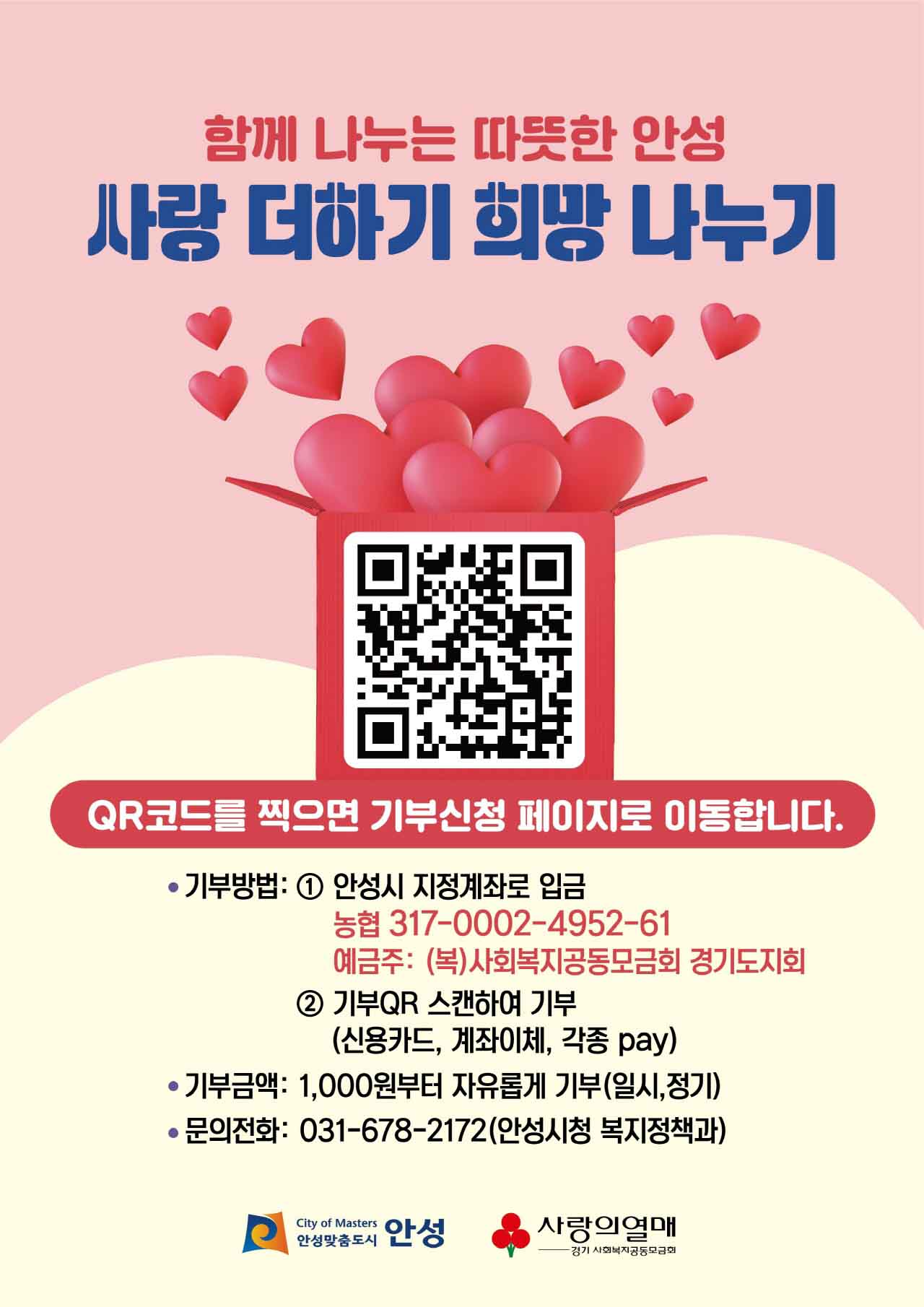 모금된 기부금(품)은「사회복지공동모금회법」에 따라 경기 사회복지공동모금회로 입금되며 추천과 공모를 통해 배분한다. 기부금(품) 관련 궁금한 사항은 안성시청 복지정책과(☎031-678-2172)로 문의하면 된다.