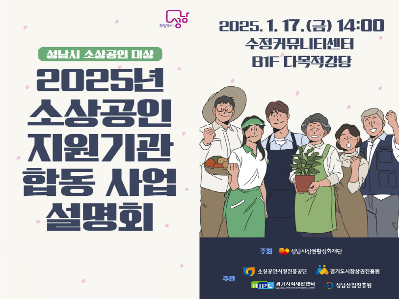〇 내 용 : 2025년 성남시(성남시상권활성화재단, 성남산업진흥원), 정부(소상공인시장진흥공단, 지식재산센터), 경기도(경기도시장상권진흥원, 경기신용보증재단) 지원사업 설명 및 질의・응답