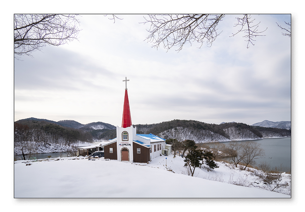 십자가를 달고 있는 빨간 종탑과 파란 지붕의 신리교회는 실제로 주일예배를 열고, 목사님 한 분이 교회를 운영하고 계셨다. 청풍호를 바로 옆에 끼고 있어 신리교회의 뒷배경인 풍광이 참 예뻤고, 도로변에 인접한 거리에 자리 잡고 있어서 꽃피는 봄날, 벚꽃이 피는 시기에 다시 방문하리라~ 다짐하며 다가올 4월을 계획했다. 여기 신리교회를 배경으로 밤하늘의 은하수 촬영은 5월 이후로 일정을 상상하니, 벅찬 감흥이 밀려온다.