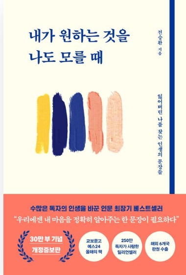 250만 독자의 사랑을 받는 ‘책 읽어주는 남자’ 전승환의 인문 에세이 『내가 원하는 것을 나도 모를 때』 개정증보판이 출간 5주년과 30만 부 판매를 기념하여 새로 출간되었다. 가슴 한편이 뭉클해지는 아름다운 문장들을 펼쳐지며, 얼어붙은 우리 마음을 녹이고 어디에서도 위로받지 못한 마음을 정확히 알아채 다독여준다. 인문, 고전, 철학, 역사, 시, 소설, 에세이에서 가려 뽑은 한 사람의 인생과 깊은 사유가 녹아 있는 문장을 통해, 앞이 보이지 않는 길에 빛을 밝히고 다정히 손잡아주며 다시 일어설 용기를 준다.