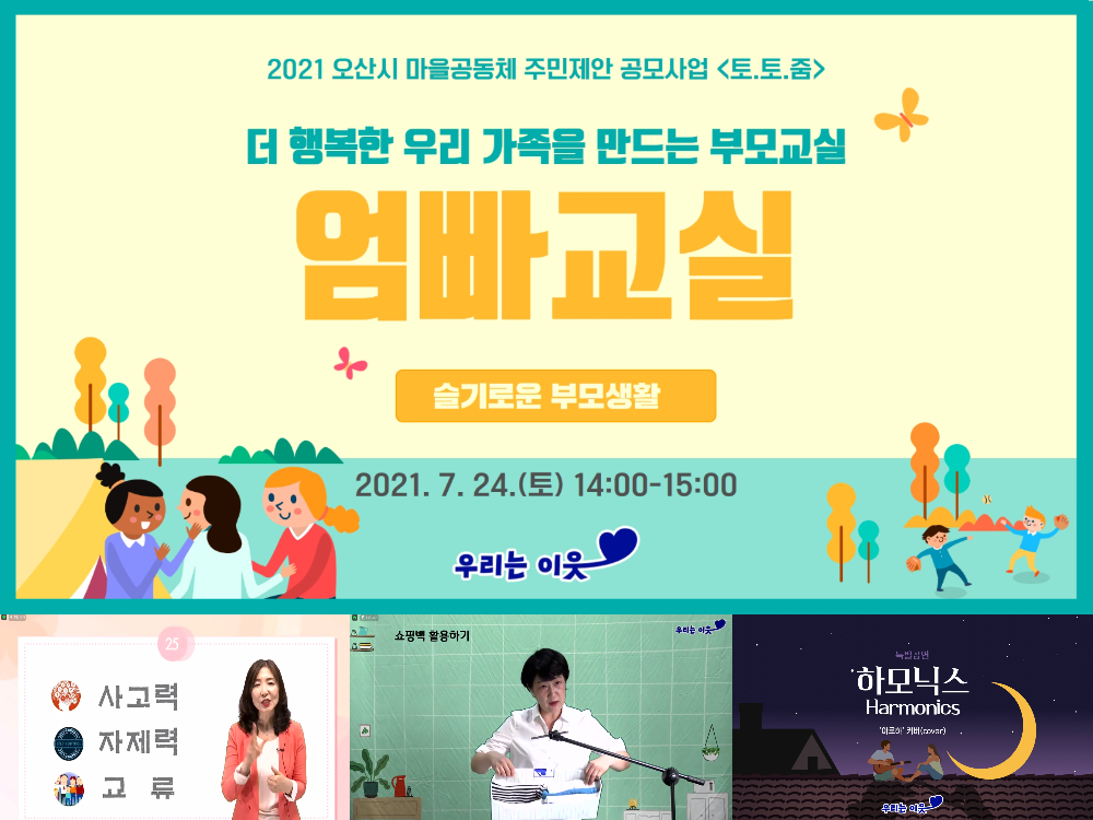 “오늘 알려주신 역량 키우기 세 가지로 아이와 서로 사고력을 키우고, 자제력을 기르고, 교류하면서 소통의 문을 열어보도록 하겠습니다! 좋은 Tip 알려 주셔서 감사합니다”(인호&민정 맘~) “정리 팁을 알게 되어 유용했고, 특히 강연의 내용이 시간에 비해 깊고, 머리에 쏙쏙 들어오게 강의해 주셨습니다. 시간이 되면 민섭이와의 에피소드도 더 듣고 싶습니다”(참가자) 우리는 이웃은 다문화 가정과 오산 시민에게 이웃과 소통하며 자존감을 향상시키는 기회를 마련하고 궁극적으로 행복한 삶을 추구할 수 있는 기회를 제공하고자, 부모교육 ‘엄빠교실‘ 외 오산시 마을공동체 주민제안 공모사업 ’토요일 토요일은 줌키즈와 함께(이하 토.토.줌)‘를 화상채팅앱인(ZOOM)으로 진행하고 있다. 토.토.줌은 오산시 관내 다문화 가정의 자녀 및 초등학생들이 참여하며 ▲인성예절강연 ▲아카펠라 ▲댄스 ▲창의미술 ▲독서토론 ▲영상크리에이터 등 다양한 아카데미, 체험 중심의 교육 프로그램으로 11월까지 주1회 진행할 예정이다. 자세한 사항및 문의는 ‘우리는 이웃’ 카카오톡 공식채널의 채팅을 통해 할 수 있다.