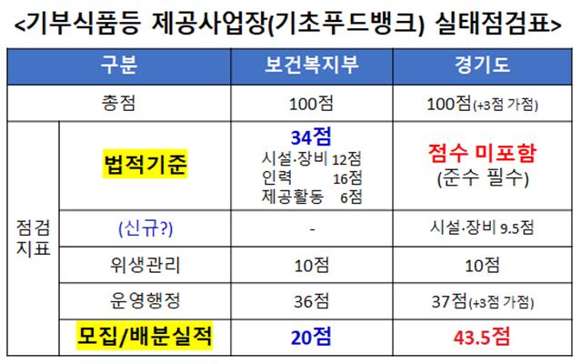 먼저, 법적 기준 점수에서 큰 차이가 있었다. 보건복지부는 시설, 장비, 인력, 제공 활동 등의 항목을 기준으로 34점을 책정했지만, 경기도는 법적기준 점수를 0점으로 책정했다. 모집 및 배분 실적 점수에서는 보건복지부가 20점을 책정한 반면, 경기도는 43.5점을 부여해 무려 23.5점의 차이를 보인다.
