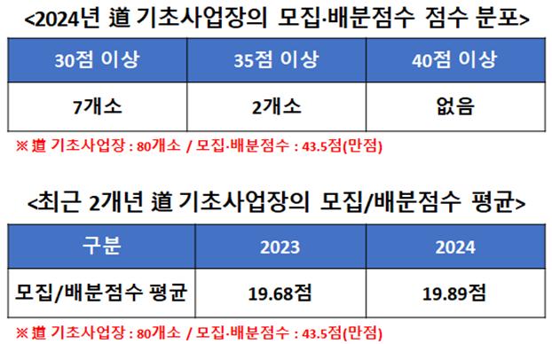 2024년 도내 기초사업장의 모집/배분 점수 평균은 19.68점이었으며, 2023년에는 평균 19.89점으로 집계되었다. 이는 43.5점을 만점으로 제시한 점수와 차이가 너무 크다.