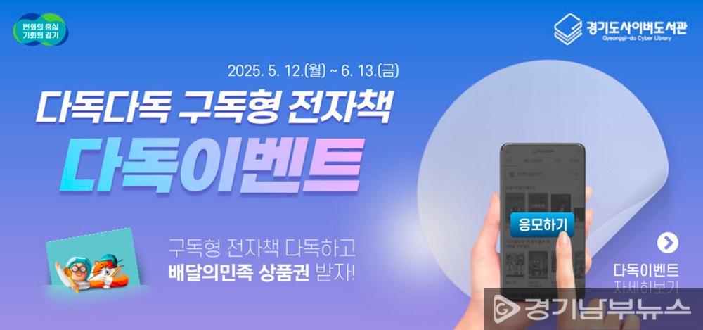 경기도가 6월 13일까지 ‘2025년 봄 시즌 한정 구독형 전자책 다독왕 선정 이벤트’를 실시한다. 이 행사는 구독형 전자책 서비스의 만족도를 높이고, 생활 속 독서 문화를 장려하기 위해 진행된다.