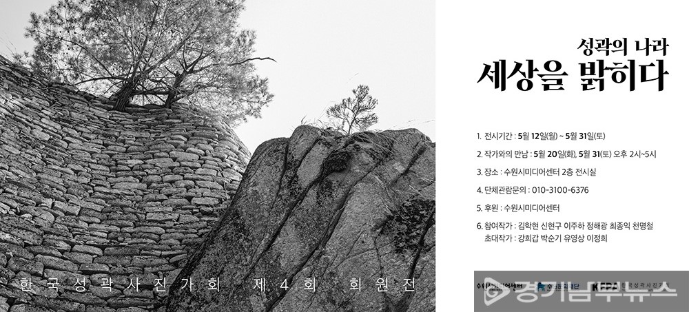 성곽의 나라, 세상을 밝히다’ 라는 주제로 한국성곽사진가회 제4회 회원전이 수원시미디어센터 2층 전시실에서 열린다. 이달 31일까지 개최되며 한국 성곽의 아름다움과 역사적 가치를 사진에 담아 알리고 우리나라 성곽의 다양한 모습을 조명하며 우리나라 성곽의 다양한 모습을 조명하며 우리 문화유산의 위대함을 알리기 위해 기획되었다.