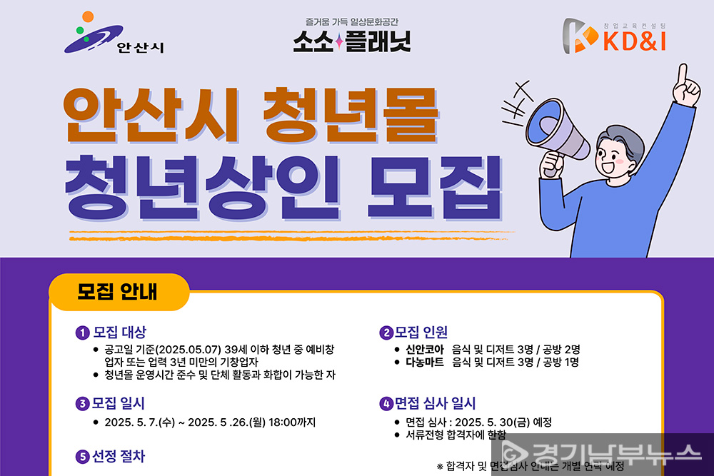 입점을 희망하는 청년은 오는 5월 26일까지 신청서와 사업계획서 등을 작성하여 이메일(ansanyouthmall@naver.com)로 접수하면 된다. 자세한 내용은 안산시청 홈페이지 새소식 게시판을 참고하거나, 안산시청 청년정책관(031-369-1789)으로 문의하면 안내받을 수 있다.