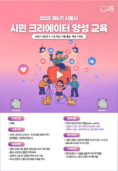 교육 참가자에게는 ▲크리에이터 심화 교육 수강 기회 제공 ▲시흥 홍보 서포터즈 활동 기회 제공 ▲우수작품 선정 시 ‘시흥시청’ 유튜브 채널 게시 등 크리에이터로 한층 더 성장할 수 있는 풍성한 혜택이 주어진다.