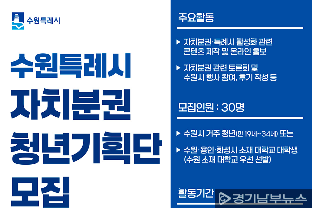 수원시는 ‘수원특례시 자치분권 청년기획단’ 제3기 참가자를 오는 6월 9일까지 모집한다. 이번 기획단은 자치분권과 특례시제의 가치와 의미를 시민들에게 쉽고 재미있게 알릴 콘텐츠를 기획하고 홍보하는 역할을 맡는다.