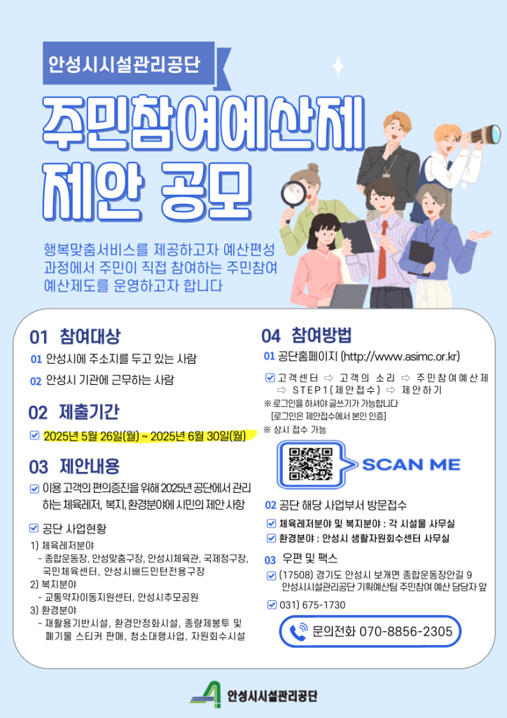 안성시시설관리공단(이사장 이정찬)은 5월 26일 월요일부터 6월 30일 월요일까지 약 1달간 안성 주민을 대상으로 주민참여예산제를 진행한다고 밝혔다.