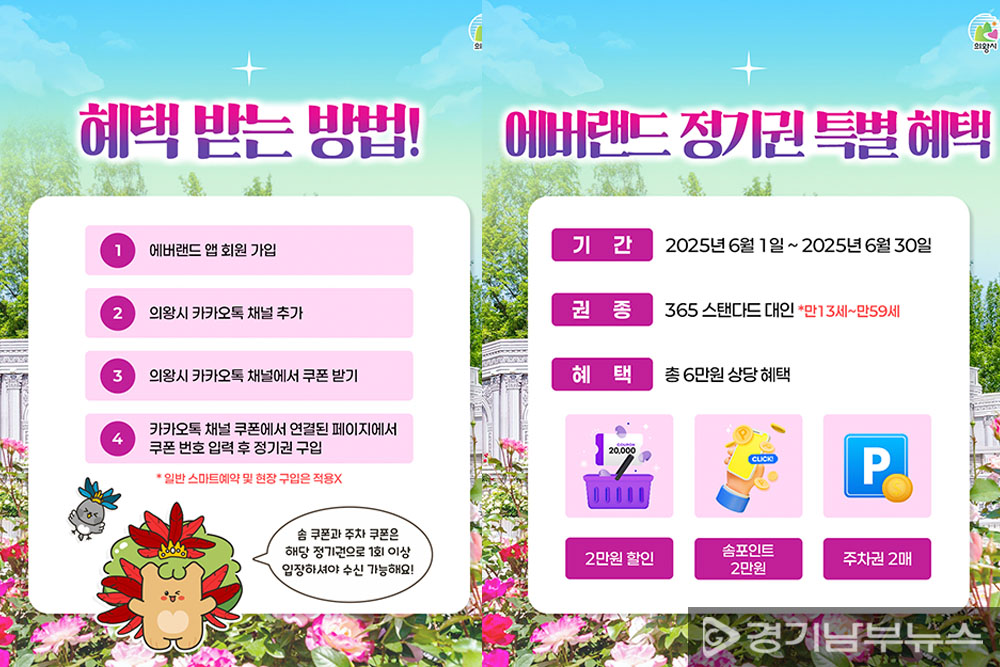 의왕시는 2025년 6월 1일부터 30일까지 에버랜드와 협력해 의왕시민을 대상으로 정기권 특별 할인 프로모션을 진행한다. 이번 혜택은 의왕시 공식 카카오톡 채널을 친구 추가한 시민이면 누구나 받을 수 있으며, 에버랜드 정기권(정상가 29만 원) 구매 시 총 6만 원 상당의 할인을 제공한다.