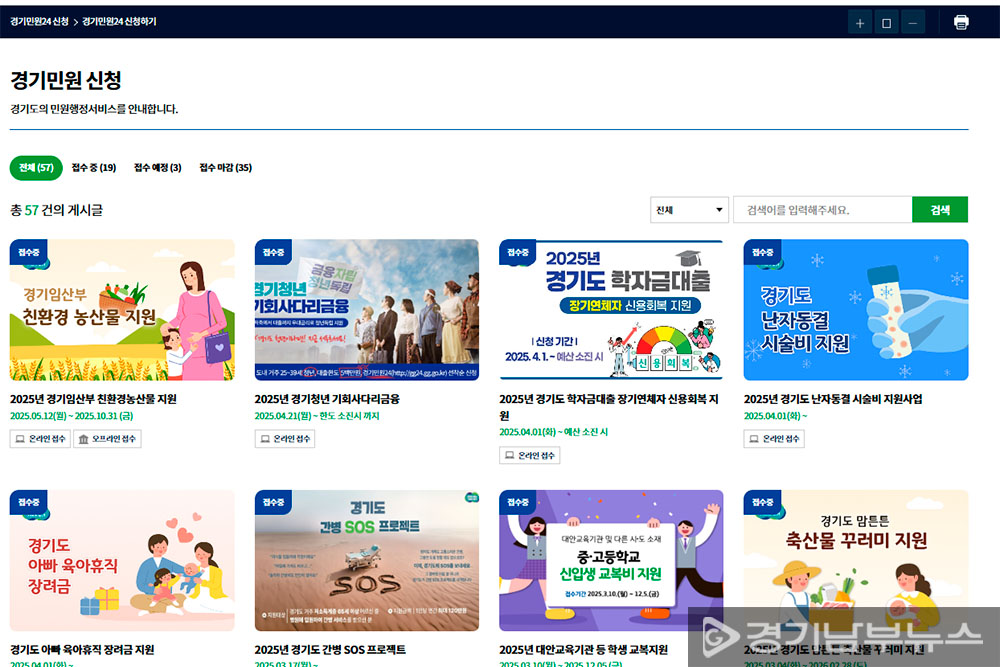 ‘경기민원24’는 주민등록 등초본, 건강보험 자격확인서 등 29종의 행정정보를 자동 연동해 불필요한 서류 제출 없이 신청 자격을 판단할 수 있도록 설계됐다. 현재 제공되는 생활 밀착형 서비스 20종에는 ▲경기형 가족돌봄수당 ▲맘튼튼 축산물 꾸러미 ▲경기도 간병SOS 프로젝트 ▲아빠 육아휴직 장려금 등 복지·보육 중심의 주요 지원사업이 포함돼 있다.