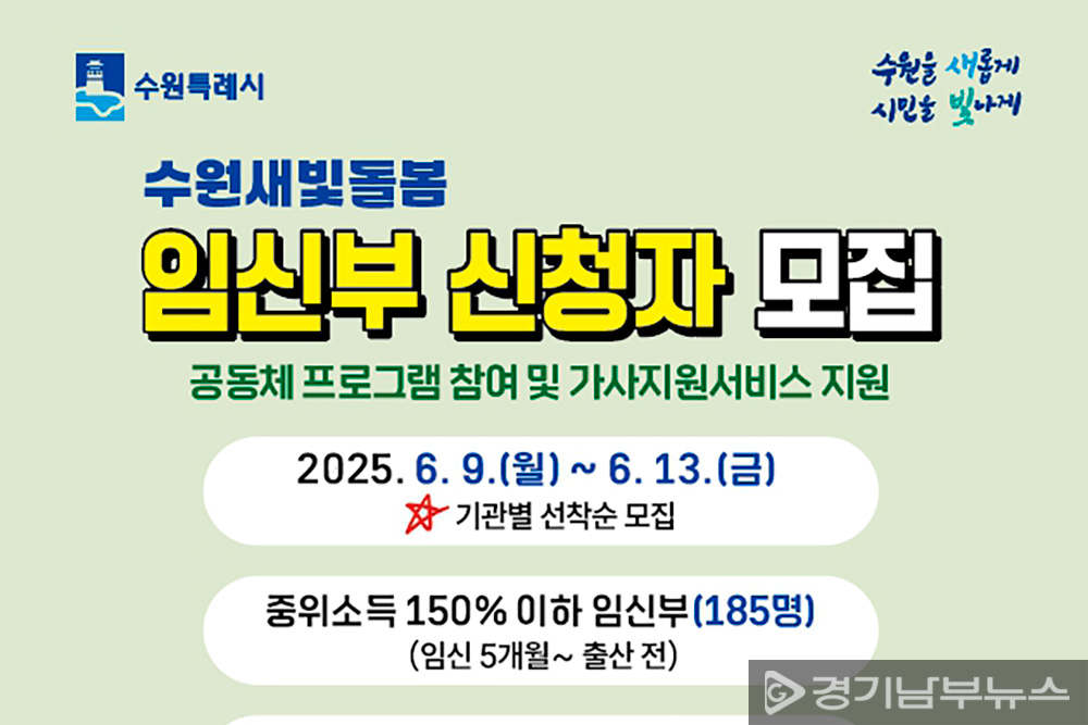수원시는 오는 6월 9일부터 13일까지, 중위소득 150% 이하의 임신부 185명을 대상으로 ‘수원새빛돌봄 임신부 돌봄공동체 지원사업’ 참여 신청을 선착순으로 받는다. 지원 대상은 임신 5개월(17주) 이상~출산 전 단계에 있는 임신부다.