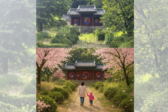 본 작가는 충북 청주시 오창읍에 위치한 송천서원을 지나가다가 태극문양이 들어간 사진을 한 장을 찍게 된다. 바로 이 사진(위) )이 원본으로 촬영한 지난 주의 상황이다. 카메라로 찍은 사진 한 장을 챗GPT의 프롬프트에 아래 내용의 문장을 입력해 넣어 보았다. “첨부한 사진 속의 장면에 가운데 길이 있어. 그 길 위에 엄마와 아기가 걸어가는 장면을 만들어줘. 그리고 왼쪽과 오른쪽에 벚꽃잎이 흩날리는 봄 풍경의 사진을 만들어줘. “[표준국어대사전]에 등재된 프롬프트(prompt )의 정의는 ‘ 정보통신시스템이 다음 명령이나 메시지, 또는 다른 사용자의 행동을 받아들일 준비가 되었음을 사용자에게 알려주는 메시지’라고 되어 있다. 결과는 뜻밖에도 프롬프트에 입력한 문장을 그대로 사진으로 표현해 주었다. 프롬프트의 내용에 의해 등장한 결과 사진이 아래 장면이다. 소름이 돋는다. 인간이 찍은 카메라의 장면을 A I는 아주 섬세한 영역의 표현조차 인간의 상상을 뛰어넘어서고 있다. 무거운 카메라를 언제까지 들고 다니며 찍을 수 있을까? 인간의 예술적 창의성과 A I 사진이 경쟁대열로 비교할 수 있을까? 벌써 A I에 사진 영역도 점령? 되었다고 할 수 있을까? 등등 사진작가로서 다소 암울한 상상을 이어지게 했다. A I를 사진에 응용하거나 활용하는 역이용의 발상을 예술의 창작으로 볼 수 있을 것인가? 두 대의 카메라를 앞에 놓고 보이지 않는 답을 찾고자 하는 본 작가는“ 나는 그래도 사진작가이다. ” 라고 외쳐본다.