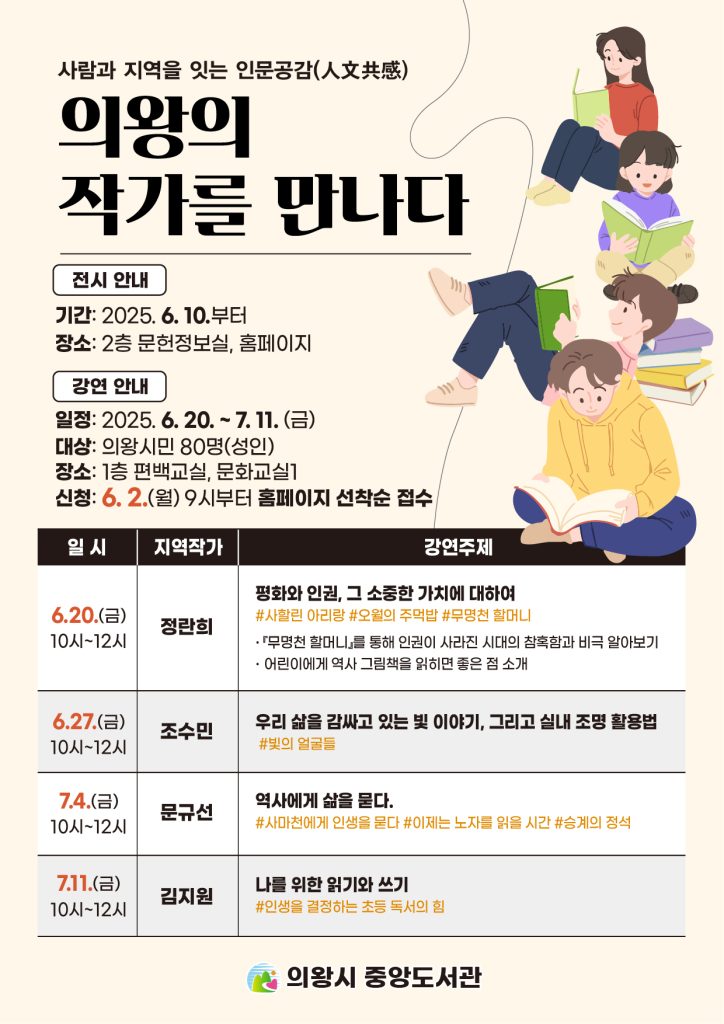지난 10일부터 진행된 지역 작가의 도서 전시(109권)를 시작으로 ▲6/20(금) 정란희 작가의 “평화와 인권, 그 소중한 가치에 대하여”▲ 6/27(금) 조수민 작가의 “우리 삶을 감싸고 있는 빛 이야기, 그리고 실내 조명 활용법”▲7/4(금) 문규선 작가의 “역사에게 삶을 묻다”▲ 7/11(금) 김지원 작가“나를 위한 읽기와 쓰기”강연회가 각각 이어진다.