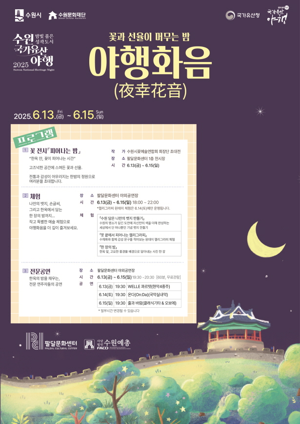 ‘밤빛 품은 성곽도시, 2025 수원 국가유산 야행(夜行)’이 6월 13일부터 15일까지, 수원화성 일대인 용연, 수원천, 행궁동, 연무동을 무대로 펼쳐진다. 그 중심에서 수원예총과 팔달문화센터는 깊은 여운을 남길 특별한 야행 프로그램 ‘夜幸華音(야행화음)’을 선보인다.