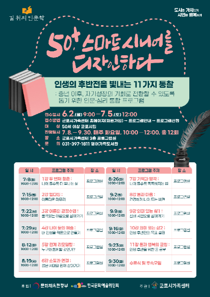 군포시가족센터가 오는 7월 8일부터 9월 30일까지 군포시 거주 50대 이상 시민을 대상으로 인문학 기반 교육 프로그램 **‘50+, 스마트 시니어를 디자인하다: 인생의 후반전을 빛내는 11가지 통찰’**을 운영한다.