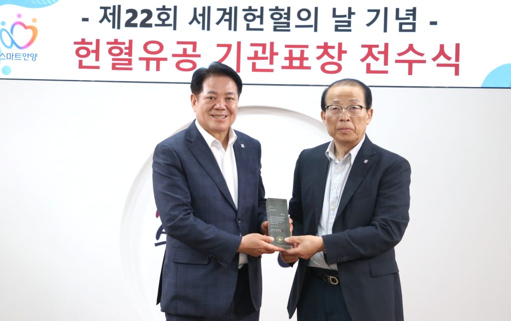 안양시는 세계헌혈자의 날을 맞아 헌혈문화 확산과 안정적인 혈액수급에 기여한 공로로 대한적십자사 혈액관리본부장 기관표창을 수상했다.