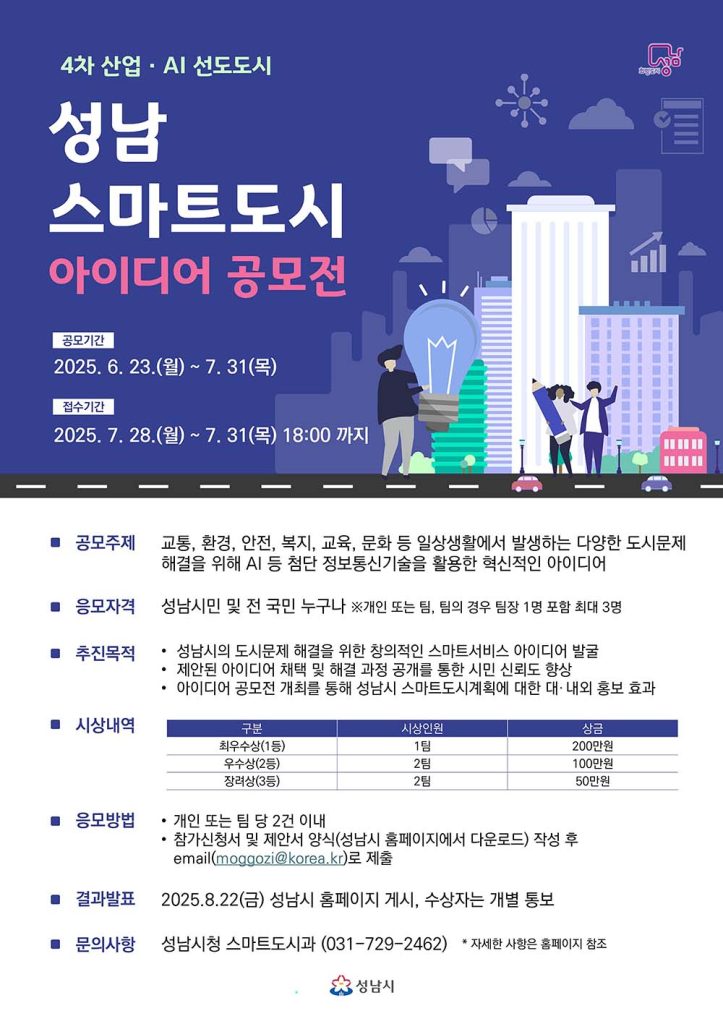 성남시가 인공지능(AI)과 정보통신기술(ICT)을 기반으로 한 시민 아이디어 공모전을 전격 개최한다. 4차 산업혁명 시대를 맞아 시민과 함께하는 스마트도시 구현을 목표로, 일상 속 도시문제 해결을 위한 창의적인 아이디어를 발굴하겠다는 취지다.