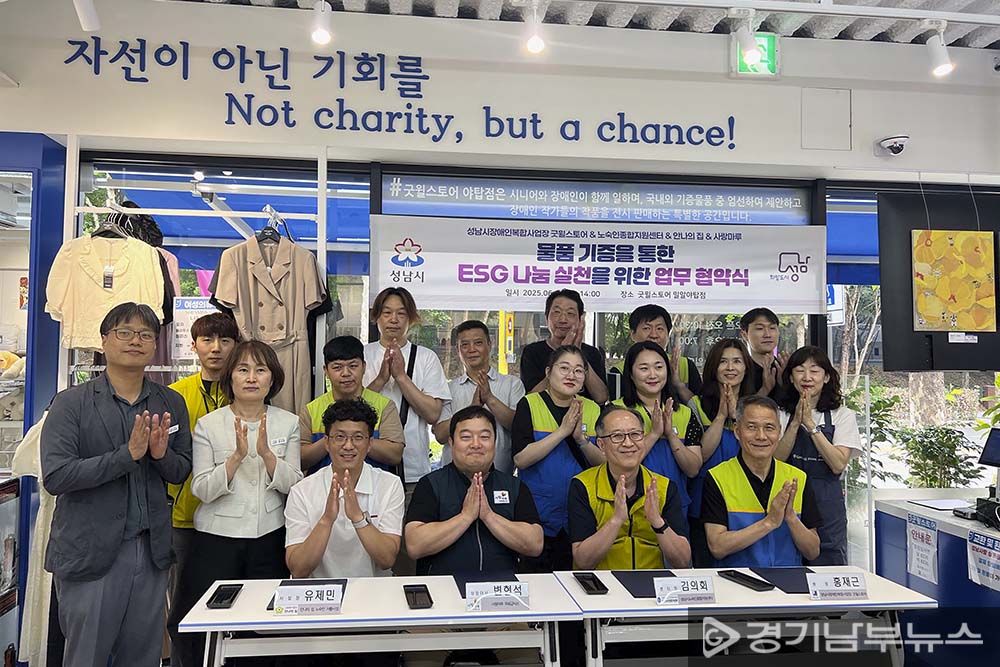 성남시가 기증받은 의류를 활용해 장애인의 일자리 창출과 노숙인의 자립을 동시에 지원하는 선순환 복지사업을 본격 추진한다.시는 24일 오후 야탑동 굿윌스토어(장애인 직업재활시설)에서 노숙인종합지원센터, 안나의집 등 5개 기관과 ‘ESG 나눔 실천–기증 의류 선순환 사업’ 협약을 체결했다고 25일 밝혔다. 이번 협약은 환경 보호와 사회적 약자의 상생을 함께 실현하는 ESG(환경·사회·지배구조) 모델로 주목된다.