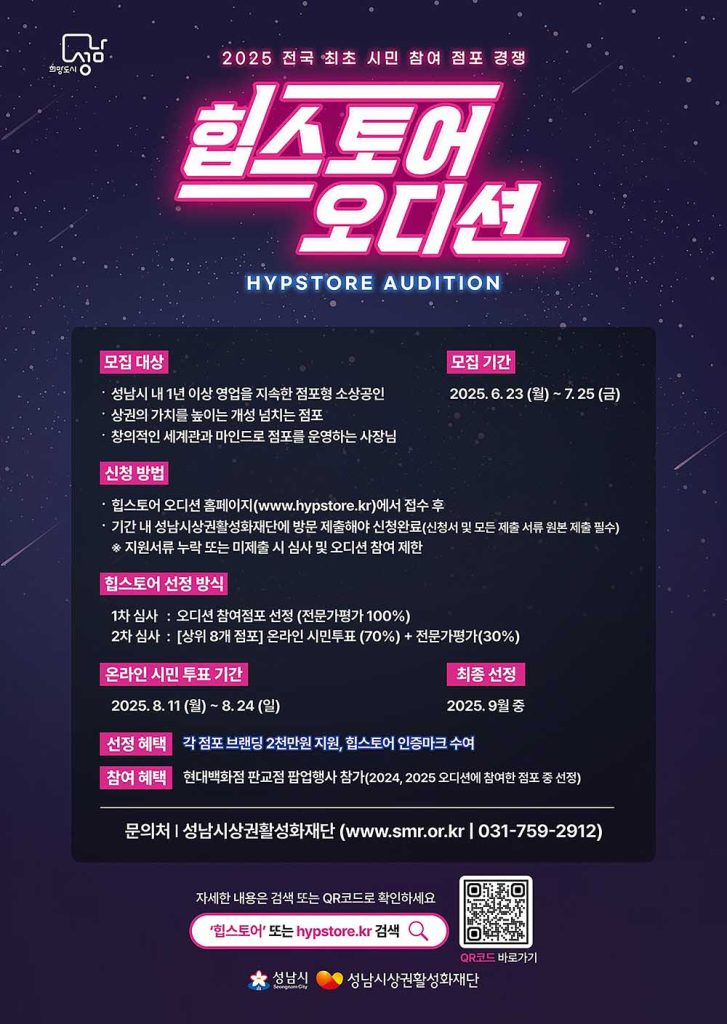 자세한 내용은 성남시상권활성화재단 홈페이지 및 힙스토어 오디션 공식 홈페이지(www.hypstore.kr)에서확인할 수 있다.