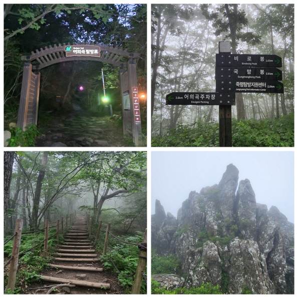 어의곡삼거리 못 미친 지점에 오니 등산로가 테크로 비로봉 정상까지 이어져 있었다. 이곳부터는 하늘을 볼 수 있는데 짙은 안개와 거친 바람에 어느덧 옷은 젖어 들고 머리에서는 물방울이 떨어진다. 비로봉까지 거친 바람을 맞는데 몸이 조금씩 추위를 느껴 빠른 걸음으로 속도를 올리며 걷는다. 비로봉 정상에 도착해 보니 어떤 모녀가 벌써 와 있다. 새벽 3시에 출발해 좀 전에 도착했다고 한다. 딸은 추워 덜덜 떨고 있고 반대로 엄마는 시원해서 좋다고 했다. 결국엔 딸이 방풍 재킷이 없다며 서둘러 원점회귀를 한다. 내려가는 분들이 걱정돼 모녀에게 포도당 사탕을 두 알씩 챙겨줬다. 또, 숲속으로 들어가면 덜 추우니 안전하게 하산을 하라고 안내를 한 후, 어의곡삼거리에서 우측으로 꺾어 국망봉으로 향했다.