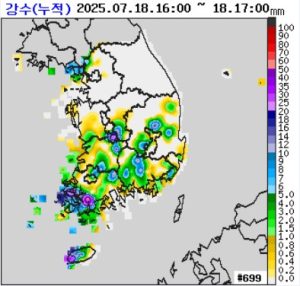기상청은 7월 18일 오후 5시 10분, 수도권을 비롯한 충청권·전라권·경남권·제주도 전역에 호우특보가 발효 중이라고 밝혔다. 현재 전남과 제주도 지역에는 시간당 20~70mm의 폭우가 천둥·번개 및 돌풍을 동반해 쏟아지고 있으며, 남부 내륙과 충청권 남부 지역에도 10~40mm의 비가 내리고 있다.