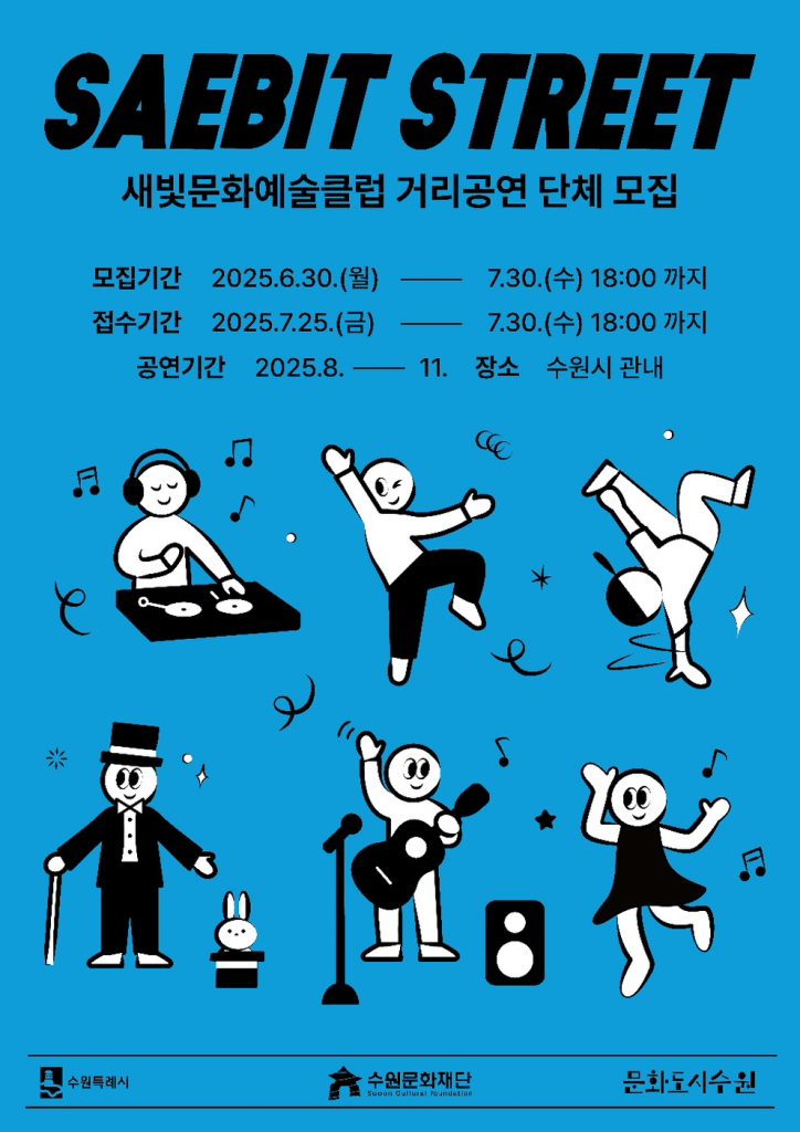 코로나 이후 침체되어 있는 지역의 문화예술 동아리들이 갈고닦은 예술적 역량을 발휘할 수 있는 기회를 제공하며 2인 이상 음악, 춤, 다원공연, 마술 등 거리공연이 가능한 단체를 모집하며 재단은 음향장비 및 공연 홍보 등을 지원할 예정이며 2025년 7월 25일부터 30일까지 문화도시 수원 홈페이지를 통해 활동계획서 등을 접수 받는다. 이번 공모를 통해 선정된 단체를 오는 8월부터 11월까지 화성행궁 및 수원시 버스킹존에서 열정과 창의력이 돋보이는 무대를 시민들에게 선보일 예정이다. 재단은 이번 사업을 통해 지역 문화예술 발전에 기여하고 수원만의 독창적 문화예술 환경을 조성하기 위해 추진하고자 하며 전문‧생활예술인들의 문화활동 활성화를 통해 각종 소외감을 문화예술로 해소하고 거리공연을 통해 시민의 문화향유권을 보장할 수 있도록 추진 할 예정이다. 수원문화재단 오영균 대표이사는 “이번 새빛 문화예술클럽 <시민의 메아리> 사업은 수원시민들의 문화적 삶의 질을 향상시키고, 지역 문화예술 동아리들이 상호 교류하고 발전할 수 있는 좋은 기회가 될 것”이라며, 많은 시민들의 지원 신청과 관심을 부탁했다.