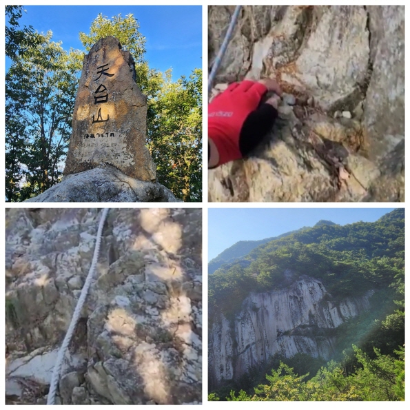 삼단폭포를 지나며, 2년 전 비 오는 날 우중산행을 했던 천태산의 기억이 떠올랐다. 천녀 은행나무를 지나 처태산 등산로(A코스)로 진입하자, 서서히 고도를 높이며 오르기 시작했다. 아침 햇살을 등에 받으며 조망터에 이르자, 장엄한 일출이 눈앞에 펼쳐졌다. 정말 아름다운 광경과 자연의 섭리에 대한 감사와 감동이 마음 깊이 밀려왔다. 이후 암벽 구간을 타고 더욱 고도를 높이자, 마침내 천태산의 명물로 손꼽히는 대표 코스와 마주하게 되었다.