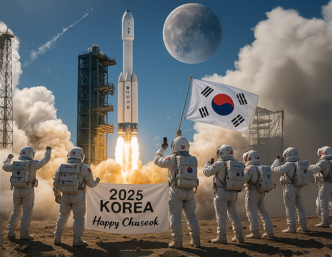 “Generate a photo showing the launch of South Korea's Nuri rocket, with seven Korean astronauts landing on Saturn, planting the Taegeukgi flag, and cheering while holding a banner written in Korean that says, “2025 KOREA Happy Chuseok"