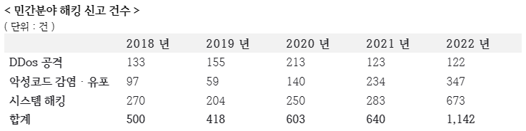 홍석준 의원이 한국인터넷진흥원에서 제출받은 민간분야 해킹 신고 건수 현황에 따르면 , 2018 년 500 건에서 2022 년 1,142 건으로 해킹 피해가 급격히 증가하고 있는 것으로 나타났다 . 피해 업종별로 보면 , 2022 년 기준 정보통신업이 409 건으로 가장 많았고 , 제조업이 245 건 , 도매 및 소매업이 156 건으로 그 다음이었다 .