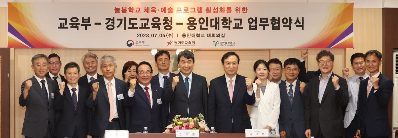이번 협약식은 교육부, 경기도교육청, 용인대가 지역과 연계한 학교체육과 예술교육을 활성화하고 다양한 늘봄학교 운영을 지원하기 위해 체결했다. 이주호 사회부총리 겸 교육부 장관, 한진수 용인대 총장 등이 참석했다.