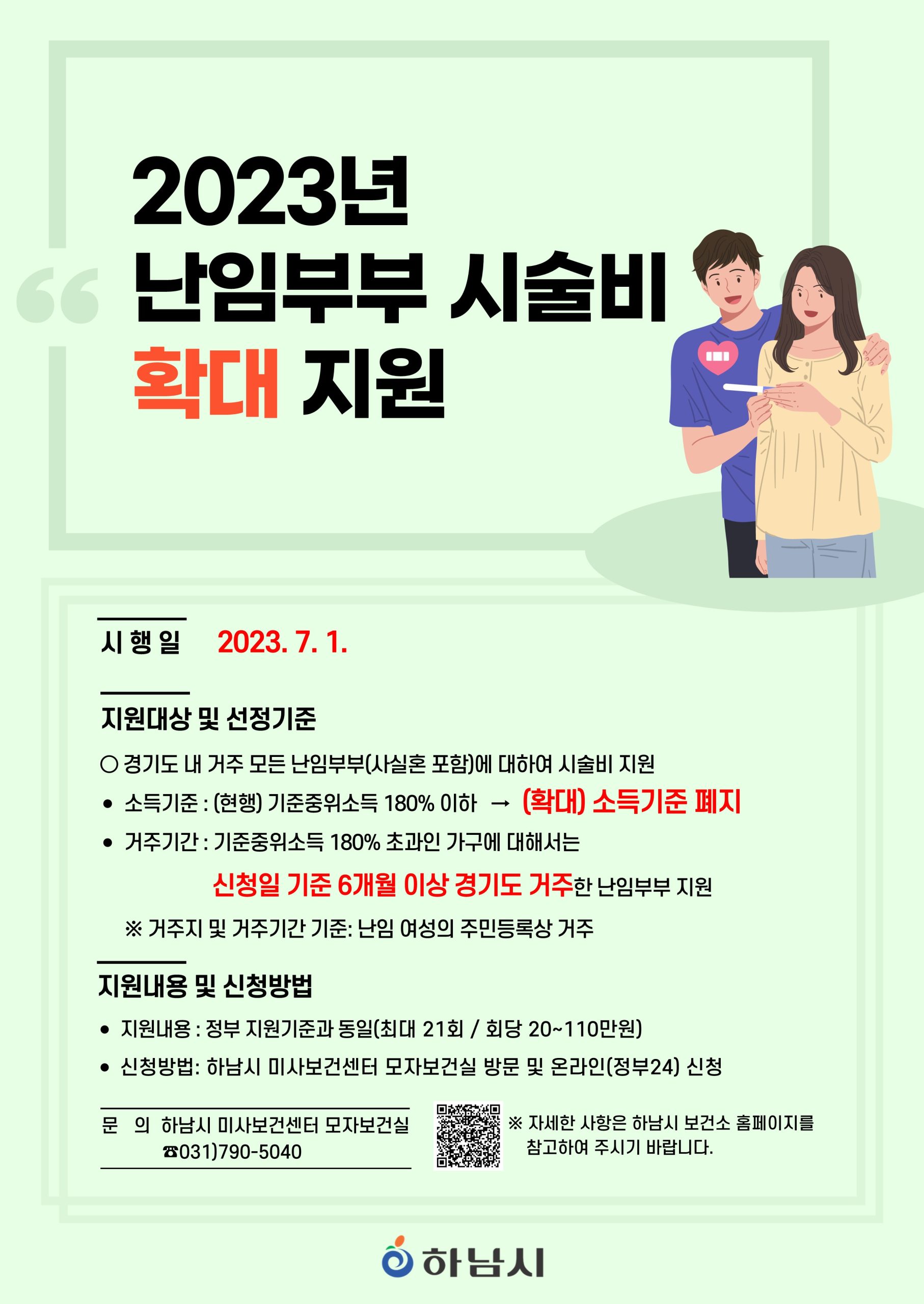 하남시(시장 이현재)는 이달부터 소득기준에 상관없이 지역 내 모든 난임부부에게 시술비를 지원한다고 밝혔다. ‘경기도형’ 난임부부 시술비 확대 지원 방침에 따라 그동안 기존 기준중위소득 180% 이하 난임가구에만 지원하던 소득기준 자격요건이 전면 폐지됐다.