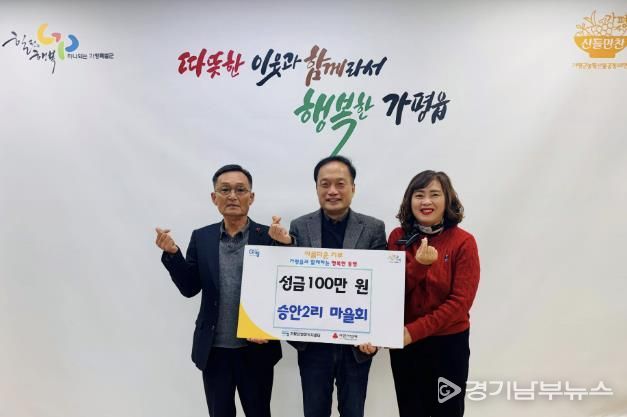 [경기남부뉴스 홍복순 기자] 가평군 가평읍 승안2리 마을회가 최근 가평읍 행정복지센터을 찾아 취약계층 지원을 위한 성금 1백만 원을 전달했다.