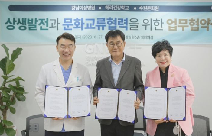 지난 6월 27일 수원문화원은 수원 강남여성병원 6층 대회의실에서 강남여성병원, 헤라건강학교와 함께 ‘상생발전과 문화교류 협력을 위한 업무협약식’을 열었다. 이날 행사에는 김봉식 수원문화원장, 성영모 강남여성병원장, 허수진 헤라건강학교 총회장 등을 비롯한 관계자 20여명이 참석했다.