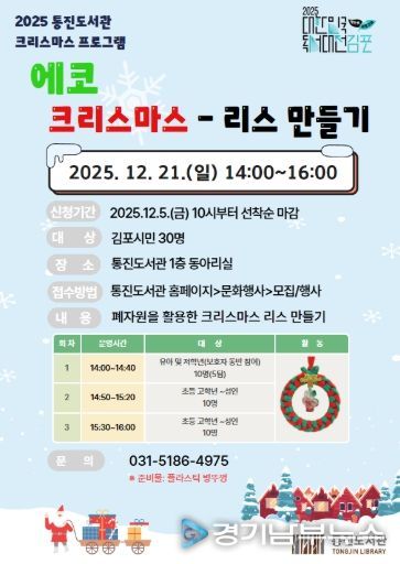 ‘에코 크리스마스 리스만들기’는 12월 21일 오후 2시부터 연령대별로 총 3회차로 나뉘어 통진도서관 1층 문화교실에서 진행되며, 참여 신청은 12월 5일 오전 10시부터 통진도서관 홈페이지 문화행사 신청(모집/행사)페이지에서 김포시민 30명을 선착순 모집한다.