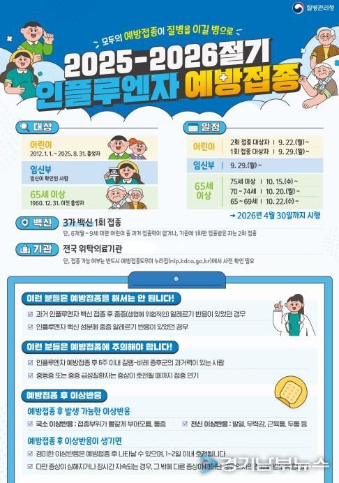 평택시 송탄보건소 관계자는 “인플루엔자 백신은 인플루엔자 바이러스로 인한 입원, 중증화 사망 위험을 크게 낮출 수 있다”며 “아직 예방접종을 받지 않으신 65세 이상 어르신과 어린이, 임신부 등 고위험군 분들은 서둘러 접종받으시길 당부드린다”고 강조했다.