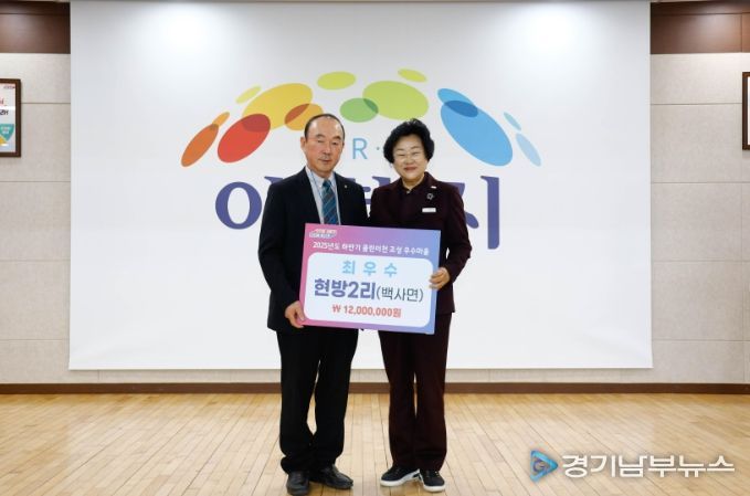 [경기남부뉴스 김혜숙 기자] 이천시는 ‘깨끗한 경기(이천)의 날’의 일환으로 추진한 2025년 하반기 클린이천조성 우수마을 평가에서 우수한 성적을 거둔 현방2리(백사면, 최우수), 남정2리(신둔면, 우수), 중리1통(중리동, 우수) 마을에 대한 시상식을 12월 2일 월례조회에서 실시했다. 이 외에도 도지2리(백사면, 장려), 후안3리(호법면, 장려), 창전9통(창전동, 장려), 단천2리(호법면, 노력), 가좌3리(부발읍, 노력), 상봉2리(설성면, 노력)가 수상했다.